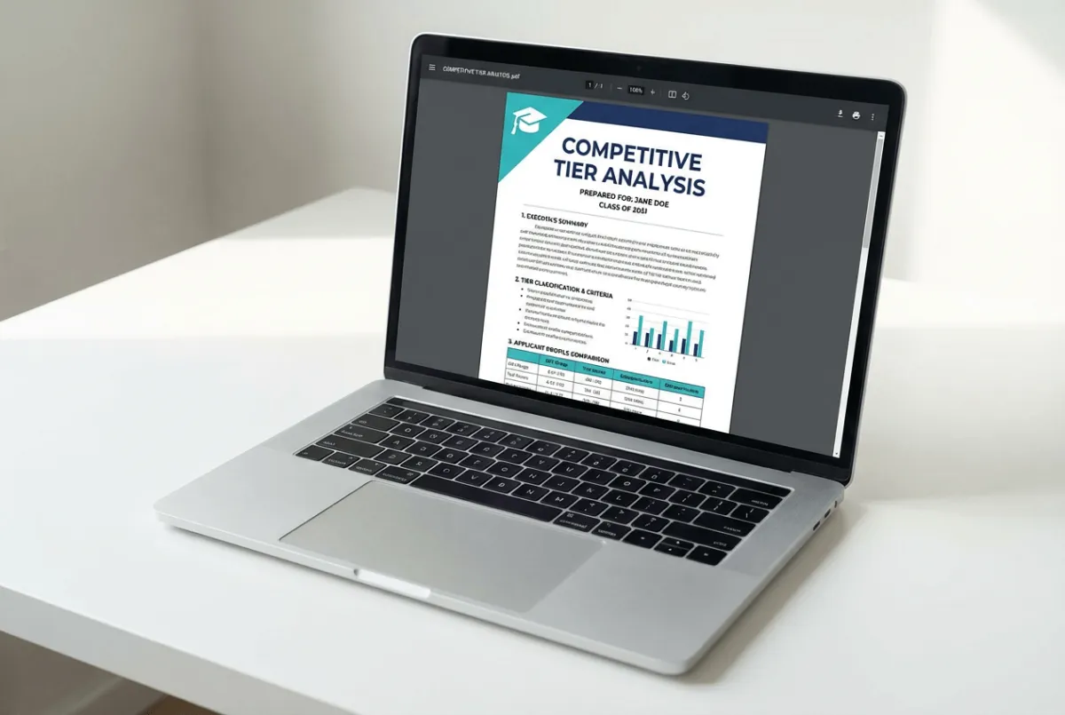 The base Assessment provides competitive tier calibration (Top 50, Top 30, Top 20 positioning). If you're in the first 50 families, you also get the Target School Calibration Add-On, which includes school-by-school competitiveness assessment and strategic application list recommendations.
