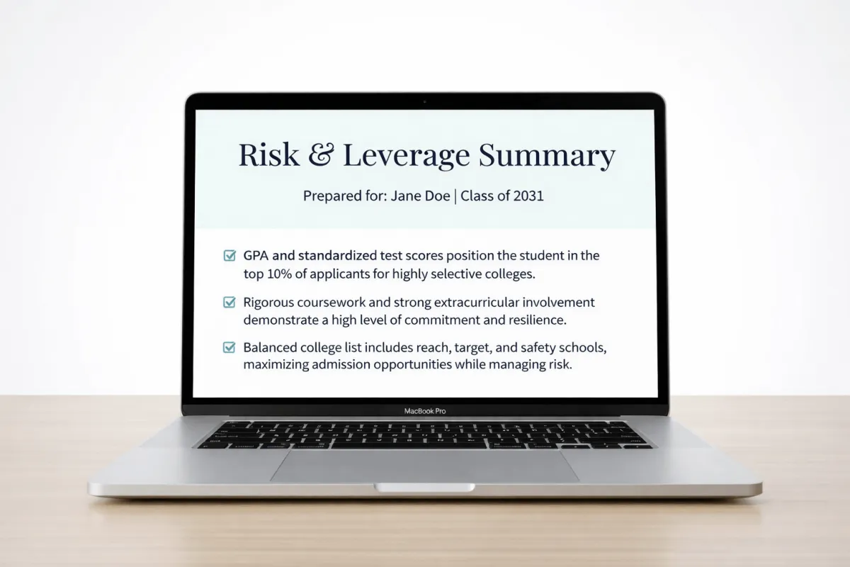 The Assessment is designed for students targeting Top 50 universities and highly selective programs. While the insights are based on elite school admissions, the strategic positioning principles apply to any competitive institution. Whether your child is targeting MIT, UC Berkeley, or your state flagship honors program, the Assessment provides valuable competitive intelligence.